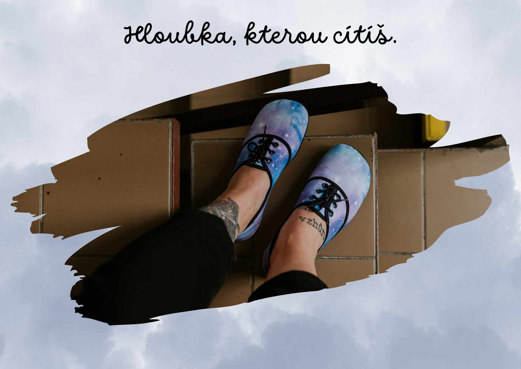 Souhvězdí velryb schované v růžovo-modré mlhovině. Vesmírné barefoot kecky s jemnou hloubkou.