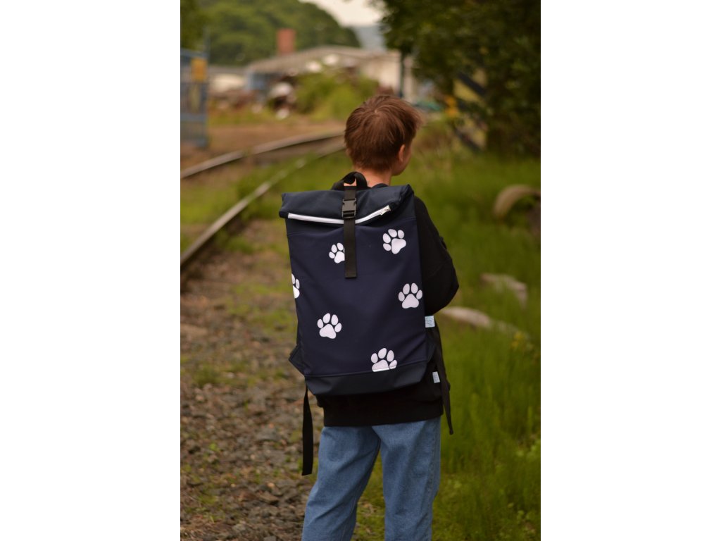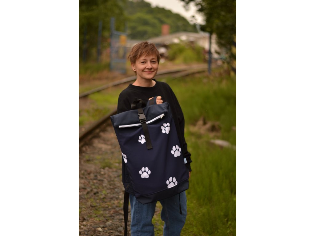 Tmavomodrý softshellový batoh s potiskem bílých tlapek je ideální na toulky se čtyřnohým parťákem i bez něj.