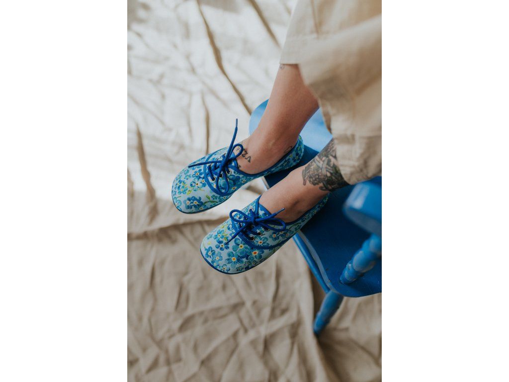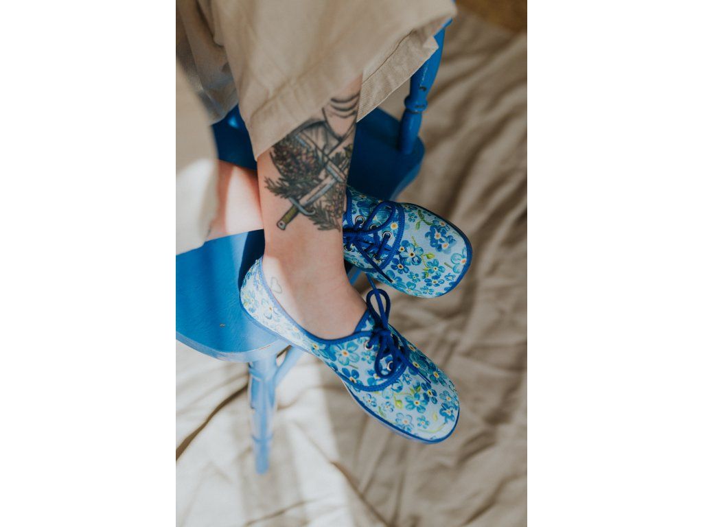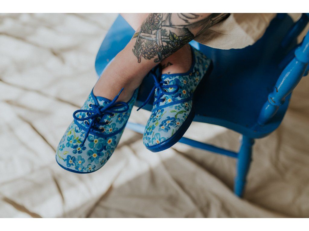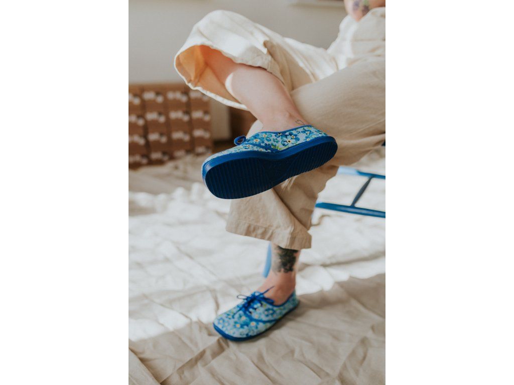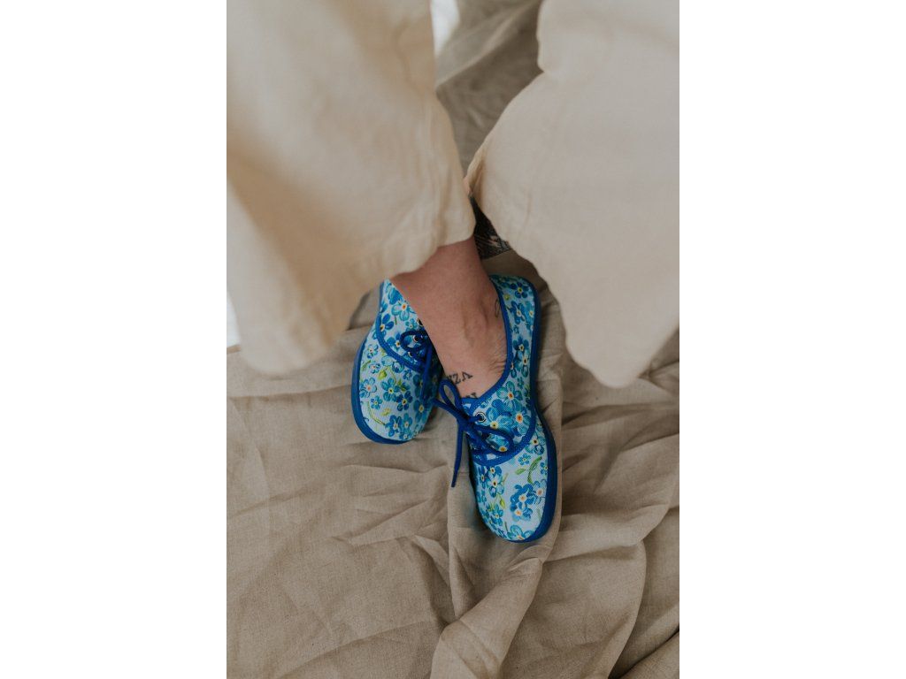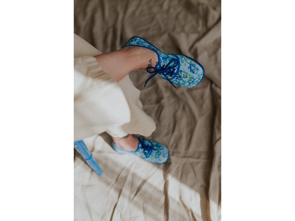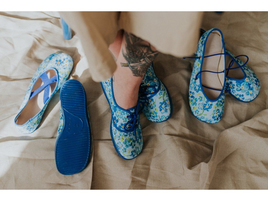Jemné modré kvítky, barefoot pohodlí a poctivá výroba bez lepidla.