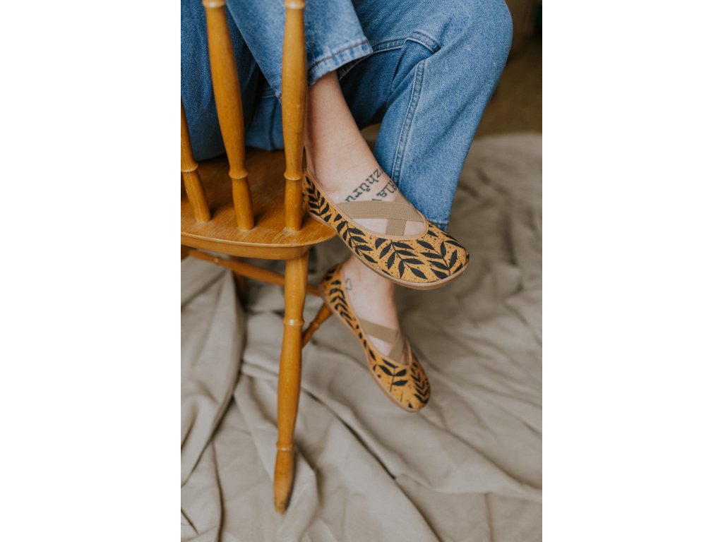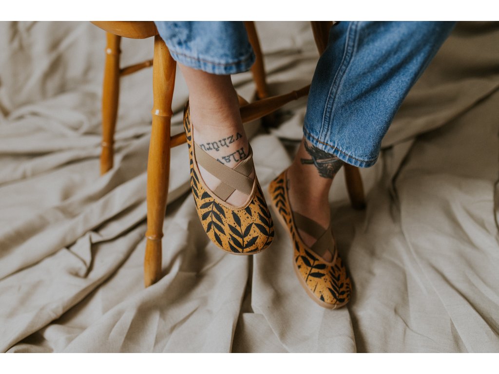 Černý jemný vzor větví na hořčicovém podkladu, barefoot pohodlí a poctivá výroba bez lepidla.