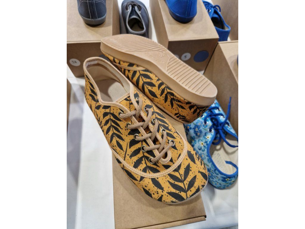 Černý jemný vzor větví na hořčicovém podkladu, barefoot pohodlí a poctivá výroba bez lepidla.