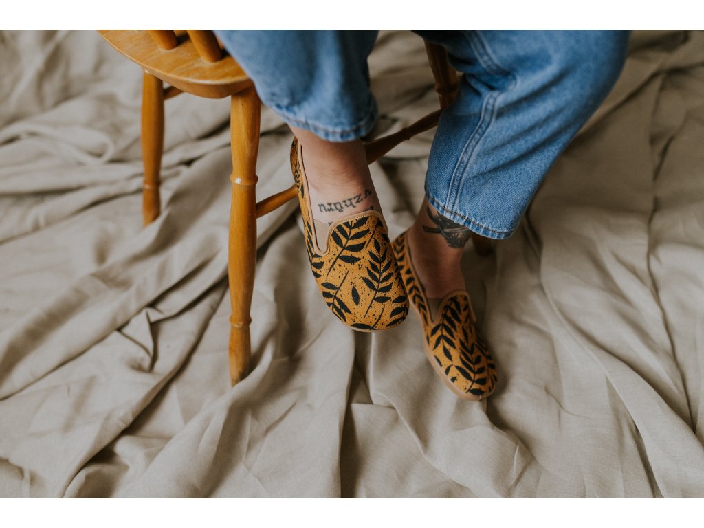 Černý jemný vzor větví na hořčicovém podkladu, barefoot pohodlí a poctivá výroba bez lepidla.